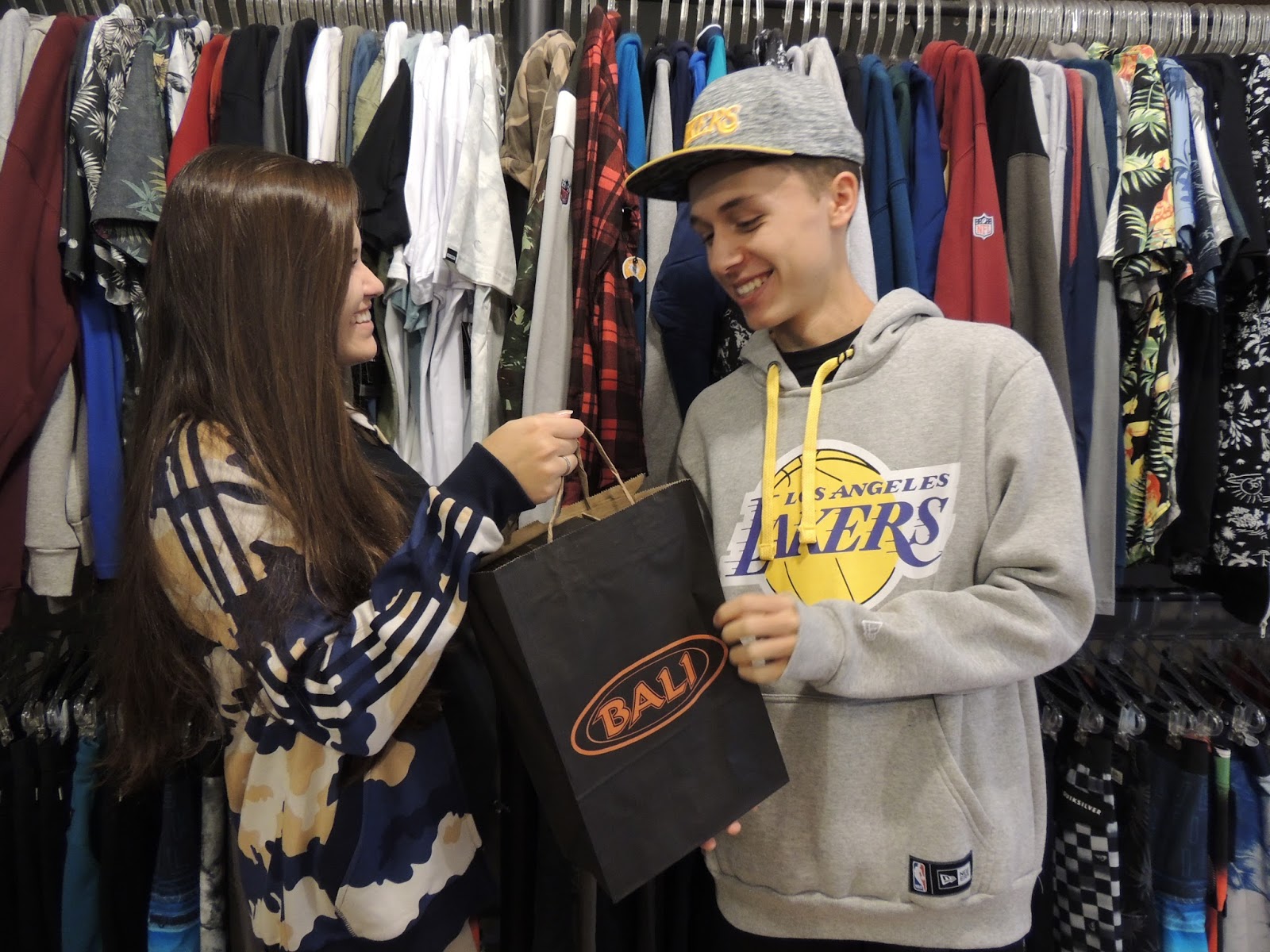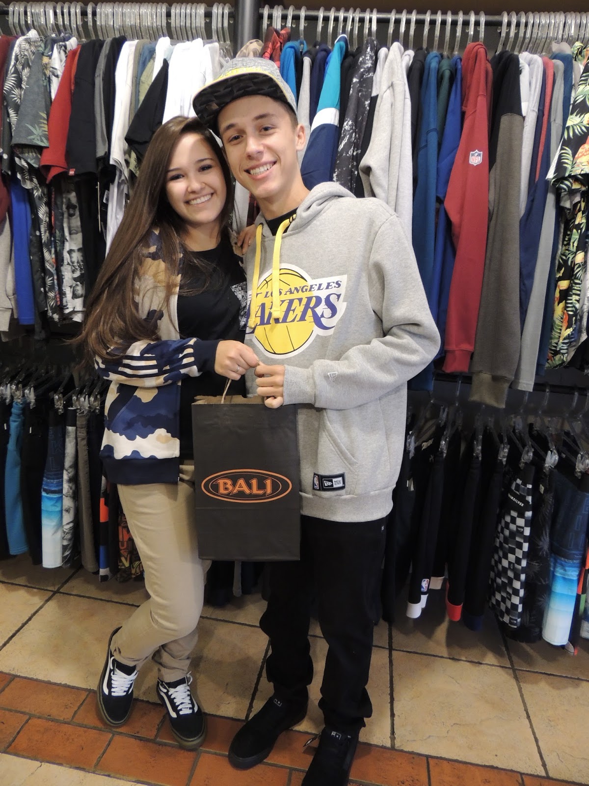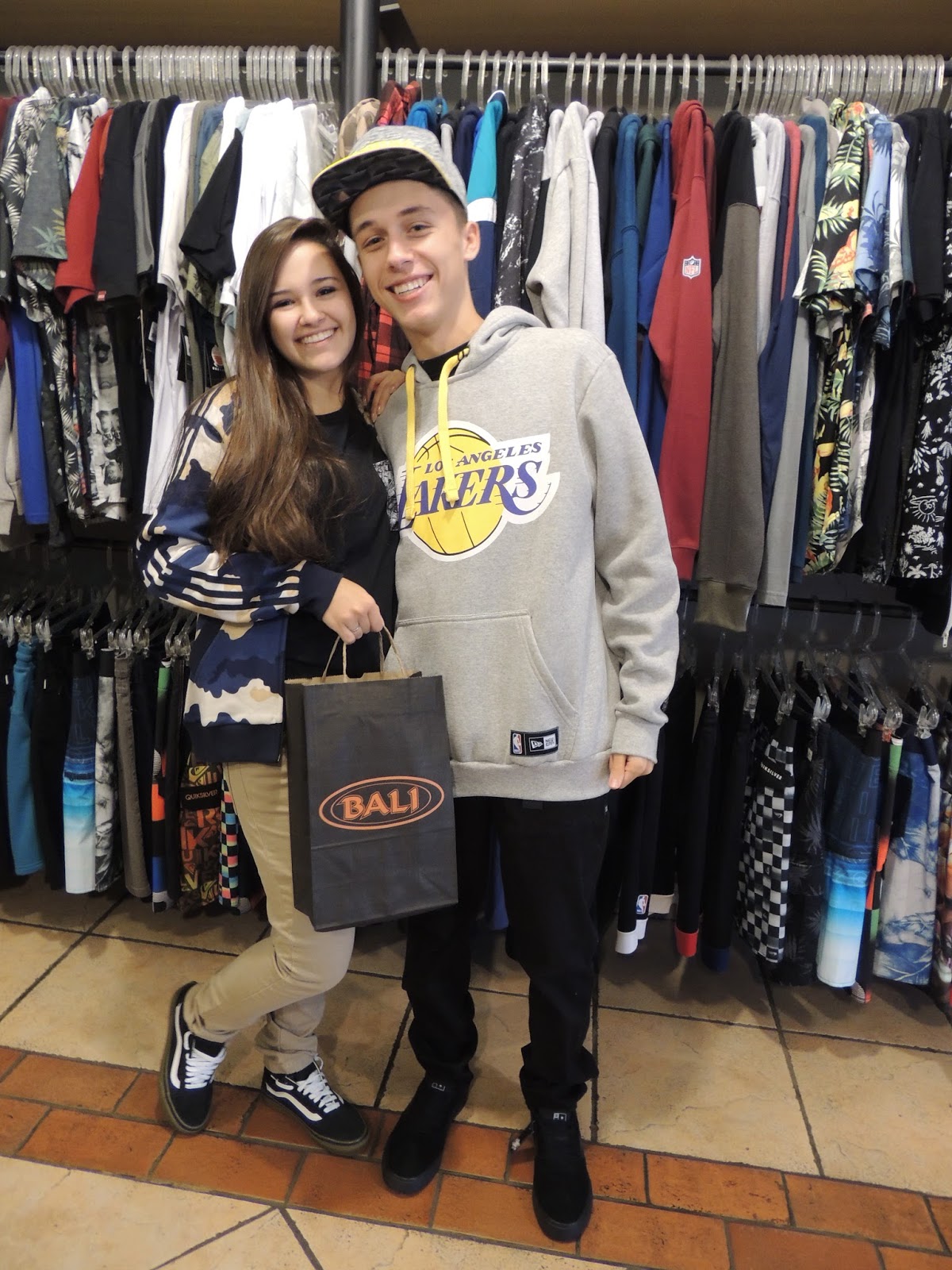 Na Bali Surf e Street os namorados Giovanna Picarelli e Mateus Rebel ficaram bem à vontade, pois já conhecem e gostam das roupas e acessórios da loja.