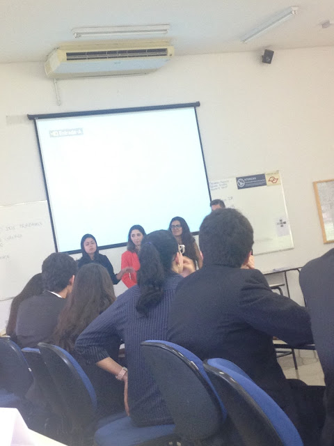 Nas simulações cada pessoa ou dupla escolhe um país, tem que conhecê-lo e também criar projetos para solucionar seus problemas. As discussões em grupo são muito interessantes e a interação muito boa.