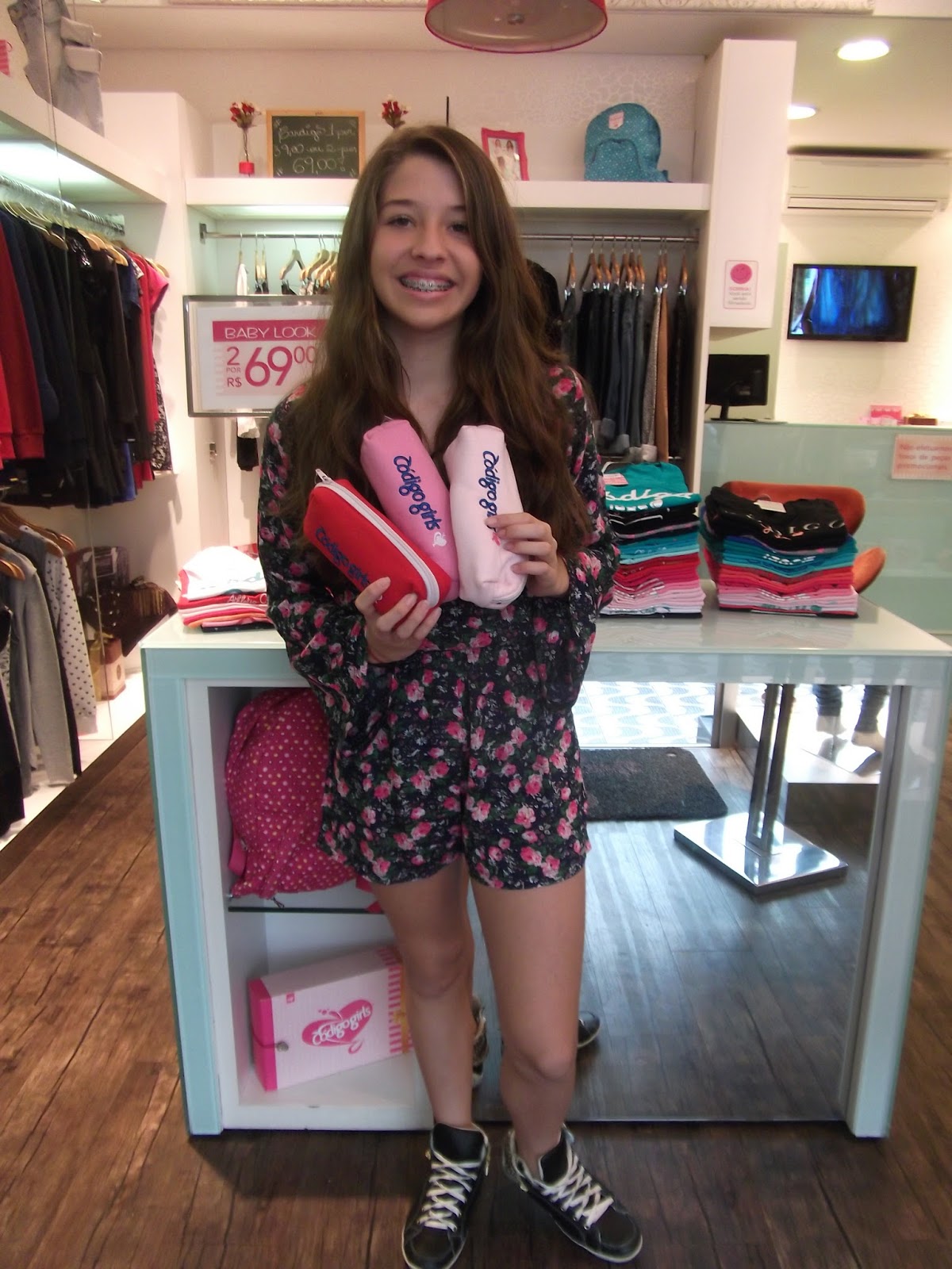 Como toda adolescente ela adorou as roupas  que encontrou na loja: vestidos, shorts, macaquinhos, camisetas, moletons e moletinhos.