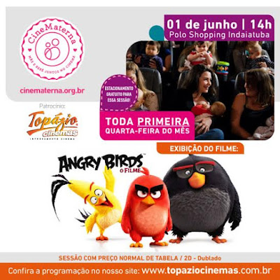 Na próxima quarta-feira, 1º de junho, o Topázio Cinemas realiza a sessão CineMaterna, especial para mães e pais aproveitarem esse momento de lazer com seus pequenos. A exibição de Angry Birds – O Filme, escolhido diretamente pelas mães, acontece no Polo Shopping Indaiatuba, às 14h. Para os clientes dessa sessão, o estacionamento é isento.