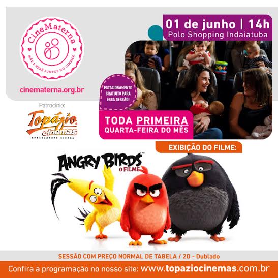 Na próxima quarta-feira, 1º de junho, o Topázio Cinemas realiza a sessão CineMaterna, especial para mães e pais aproveitarem esse momento de lazer com seus pequenos. A exibição de Angry Birds – O Filme, escolhido diretamente pelas mães, acontece no Polo Shopping Indaiatuba, às 14h. Para os clientes dessa sessão, o estacionamento é isento.